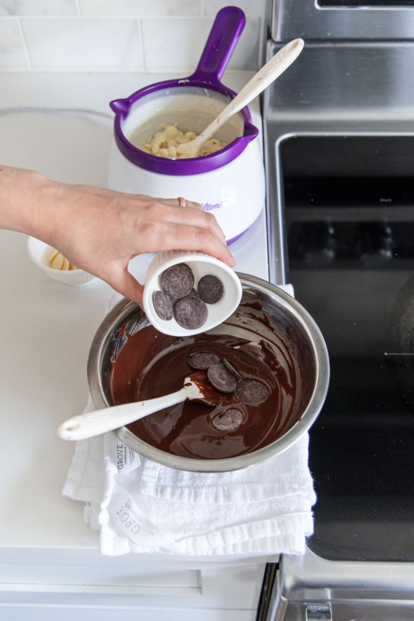 • Next it’s time to melt and temper the chocolates. Ideally, the white chocolate will be ready about 5-10 minutes after the dark chocolate, so plan your setup accordingly. It helps to have an extra set of hands to stir and keep an eye on temperatures.