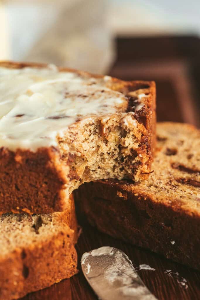 If you’re feeling indulgent (and you should), fold in a heaping cup of chocolate chips. They’ll melt into soft, silky pockets throughout the loaf and make each slice feel like dessert. Chopped walnuts are another classic move here – lightly buttery, toasty, and just the right crunch against the tender crumb. You can add one, both, or neither. Choose your own adventure!