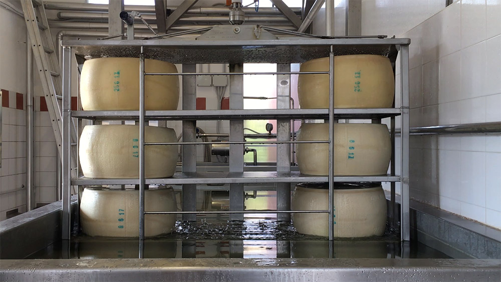 Rounds of parmesan being lowered into the brining pool on a cheese elevator. Photo by Nicola Twilley.